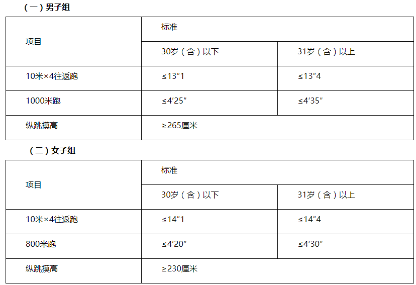體能測(cè)評(píng)三項(xiàng)全部達(dá)標(biāo)方為合格。體能測(cè)評(píng)項(xiàng)目中,縱跳摸高的測(cè)試次數(shù)不超過(guò)3次,10米×4往返跑的測(cè)試次數(shù)不超過(guò)2次,長(zhǎng)跑項(xiàng)目(男子1000米、女子800米)的測(cè)試次數(shù)為1次。