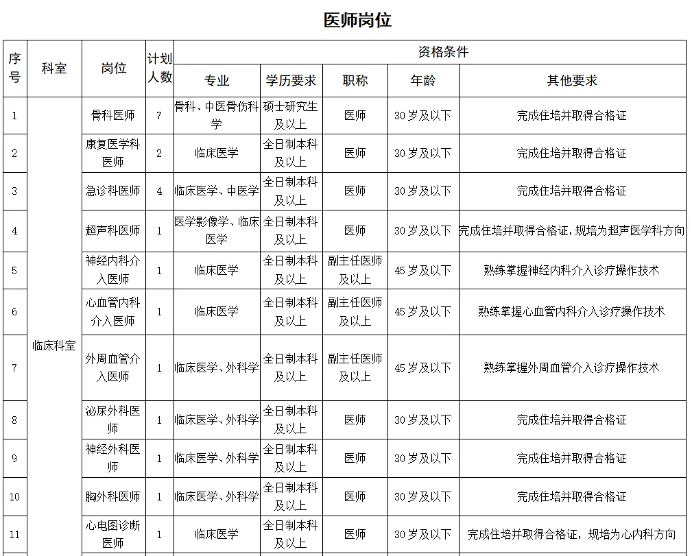 2.條件要求:具備碩士研究生及以上學(xué)歷(部分緊缺專業(yè)可放寬至本科學(xué)歷),年齡不超35歲;專業(yè)理論功底扎實,業(yè)務(wù)技術(shù)過硬,有良好的團(tuán)隊合作精神;有二級甲等及以上醫(yī)院工作5年及以上經(jīng)歷,并有三級甲等醫(yī)院進(jìn)修6個月及以上經(jīng)歷。