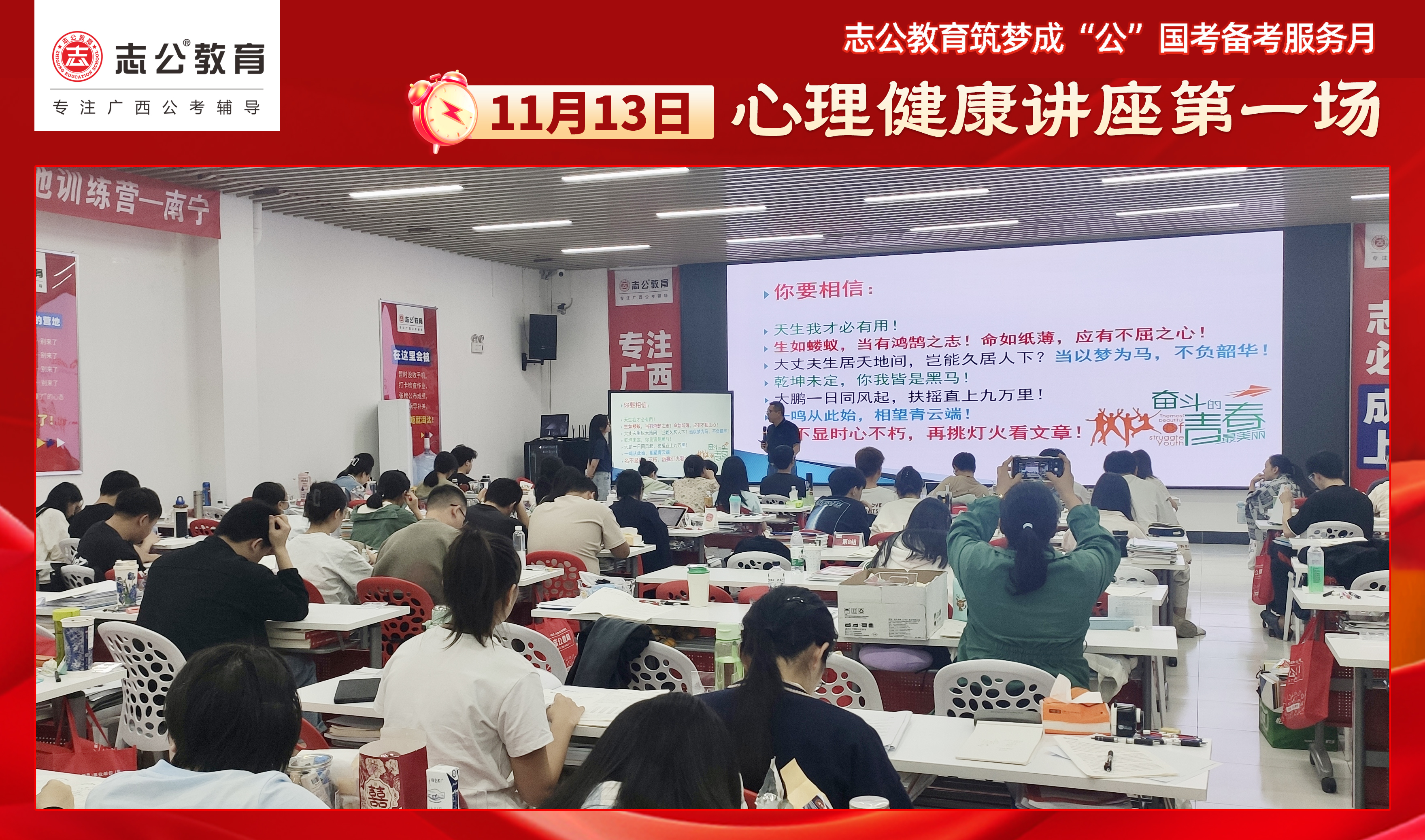 親愛的考生們,不要讓壓力成為你追夢(mèng)途中的絆腳石。在志公教育基地班,你將學(xué)會(huì)如何在國(guó)考的征程中保持從容,如何在壓力下穩(wěn)步前行。且行且看且從容,讓我們一起向著國(guó)考的勝利邁進(jìn)!第一場(chǎng)心理講座已結(jié)束,第二場(chǎng)心理講座將在11月17日舉行,期待大家以更從容自信的姿態(tài)應(yīng)對(duì)即將到來(lái)的公務(wù)員考試,加油!