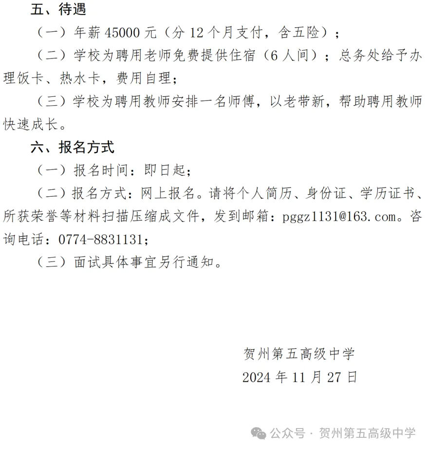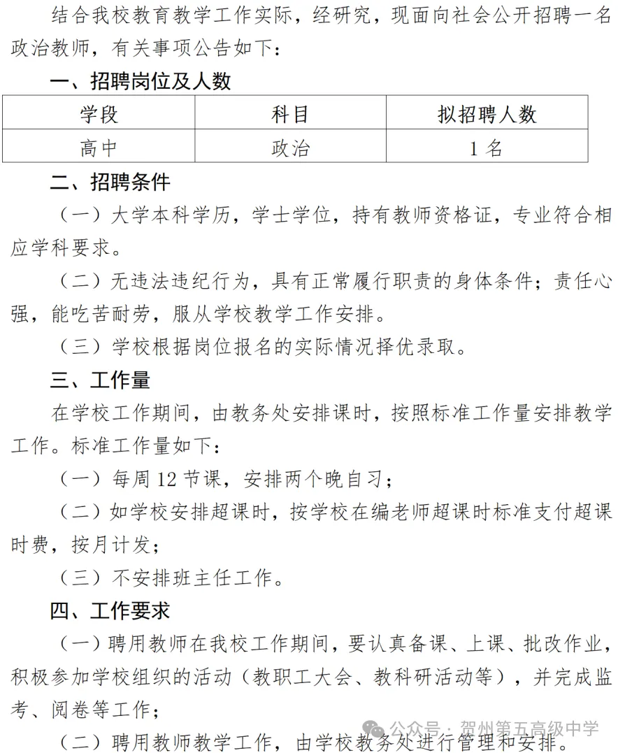 賀州第五高級中學(xué)2024年秋季學(xué)期招聘教師公告