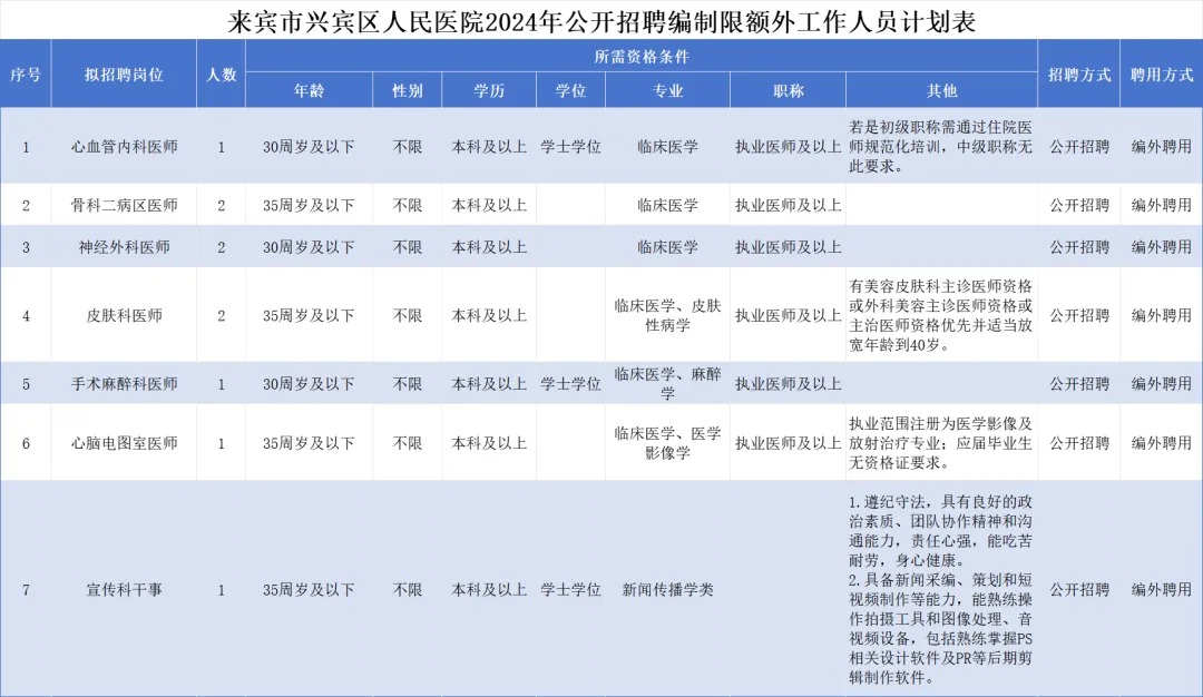 附件1:來賓市興賓區(qū)人民醫(yī)院2024年公開招聘編制限額外工作人員計(jì)劃表.xlsx附件2:來賓市興賓區(qū)人民醫(yī)院2024年公開招聘編制限額外工作人員報(bào)名表.docx