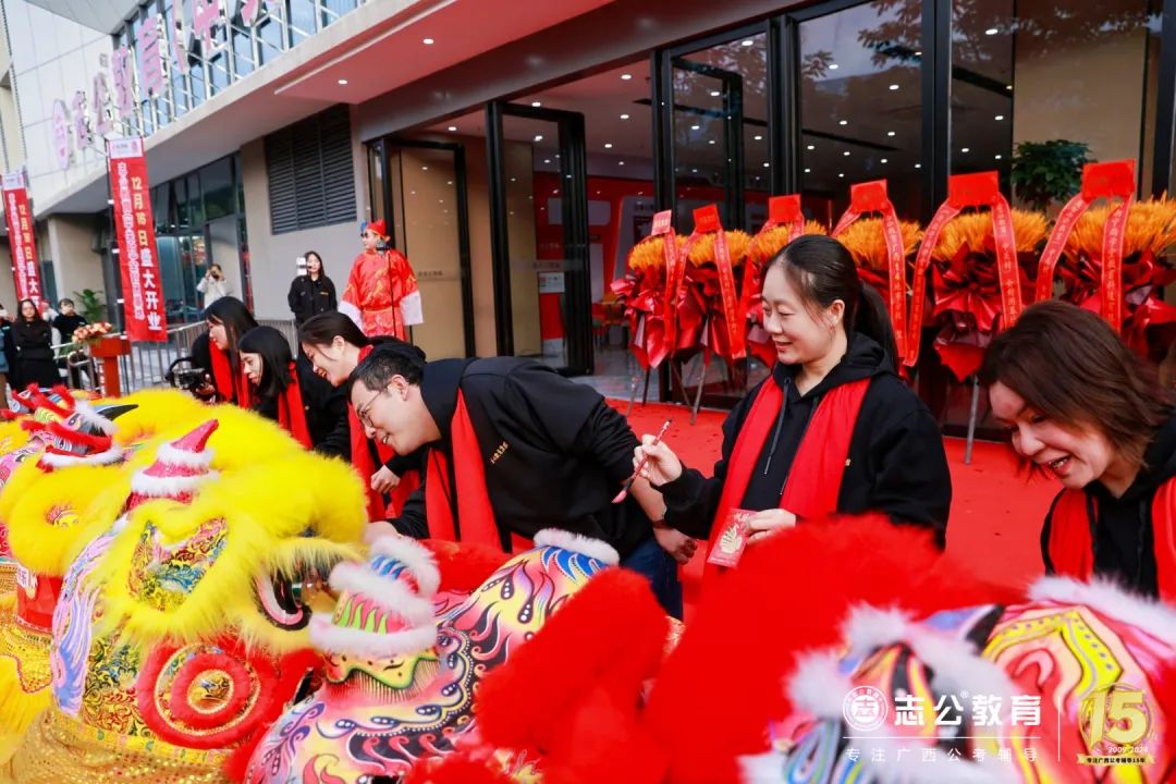 志公教育還專門請來了舞獅隊,舞獅點睛是重頭戲,董事長李勇帶領(lǐng)著公司領(lǐng)導(dǎo)們手持毛筆蘸取朱砂,對獅頭天庭進行點睛。