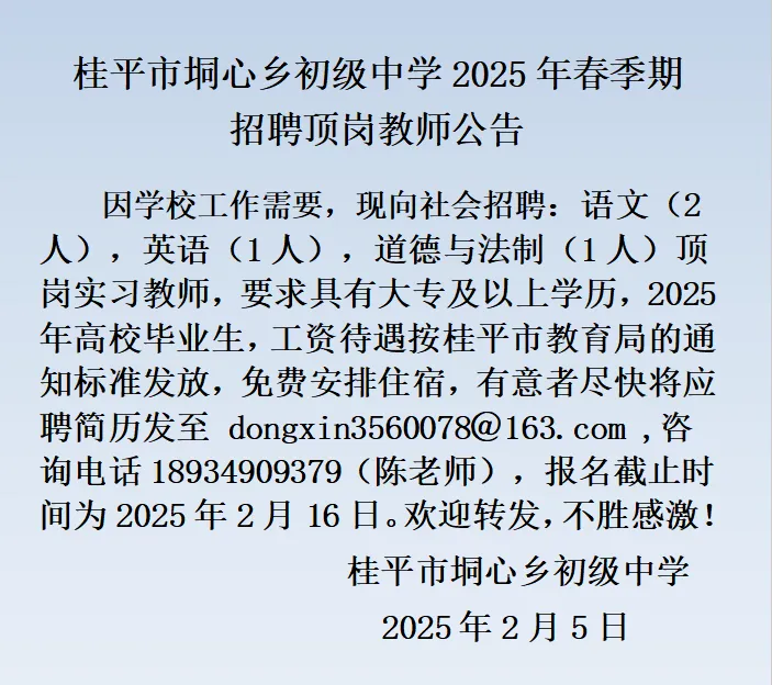 2025年春季學期貴港桂平市垌心鄉(xiāng)初級中學招聘頂崗教師公告