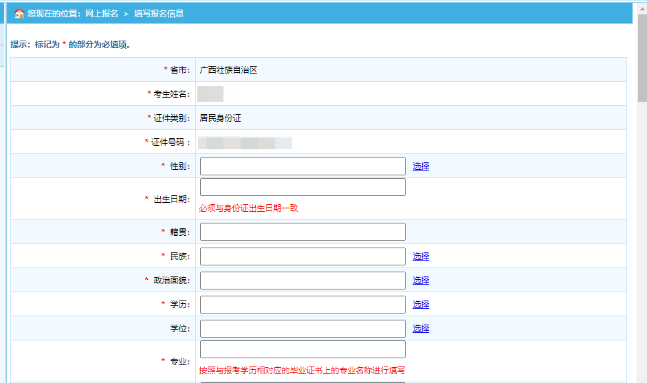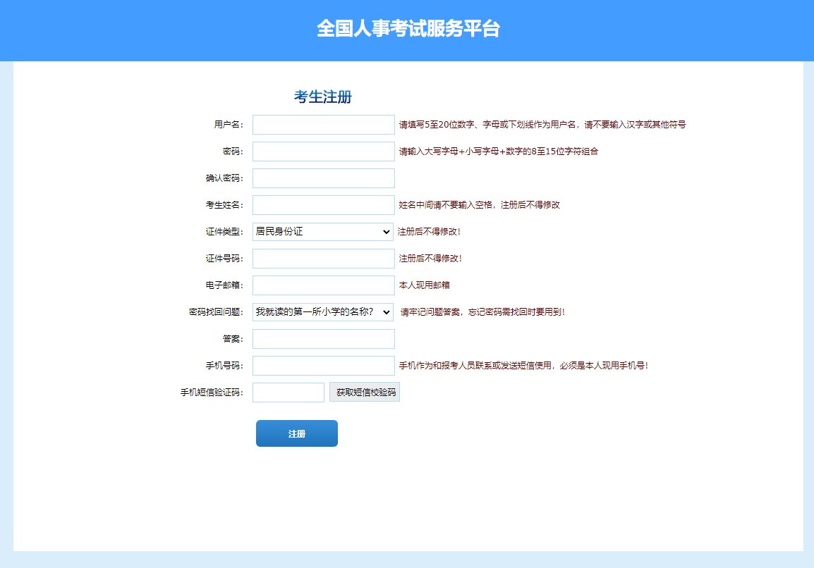 第二步:點(diǎn)擊“注冊”,進(jìn)入考生注冊頁面,考生注冊填寫個人信息