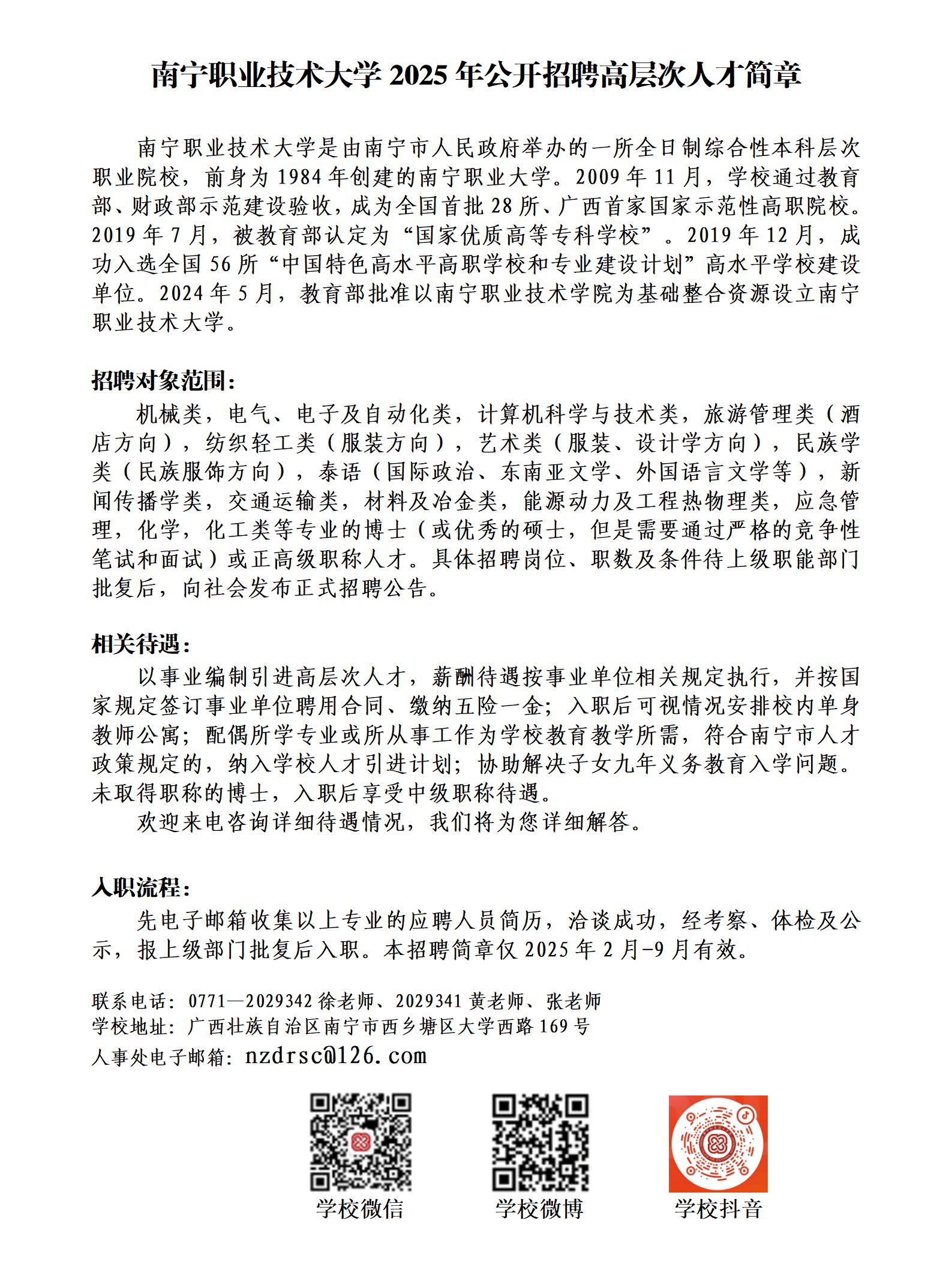 南寧職業(yè)技術大學2025年招聘高層次人才簡章