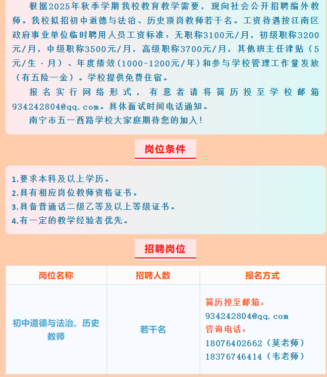 南寧市五一西路學(xué)校招聘老師若干名