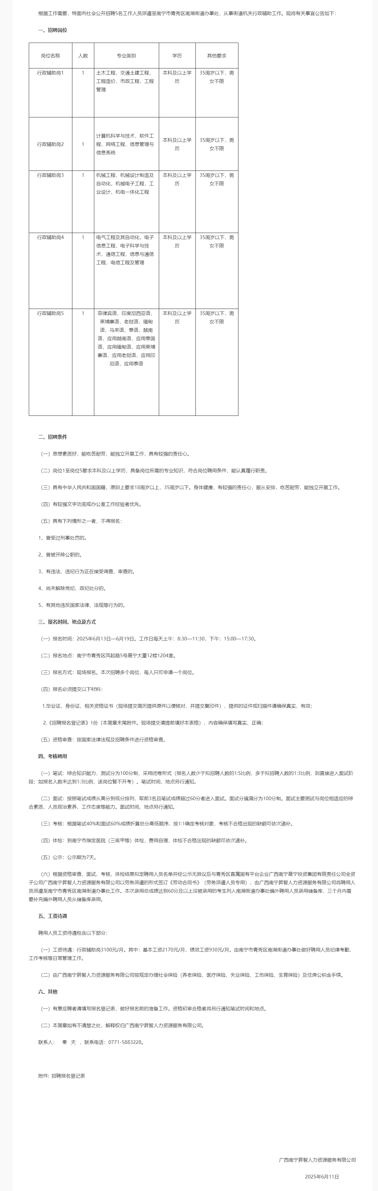 2025年廣西南寧昇智人力資源服務(wù)有限公司第22期(南寧市青秀區(qū)南湖街道辦事處)招聘5人