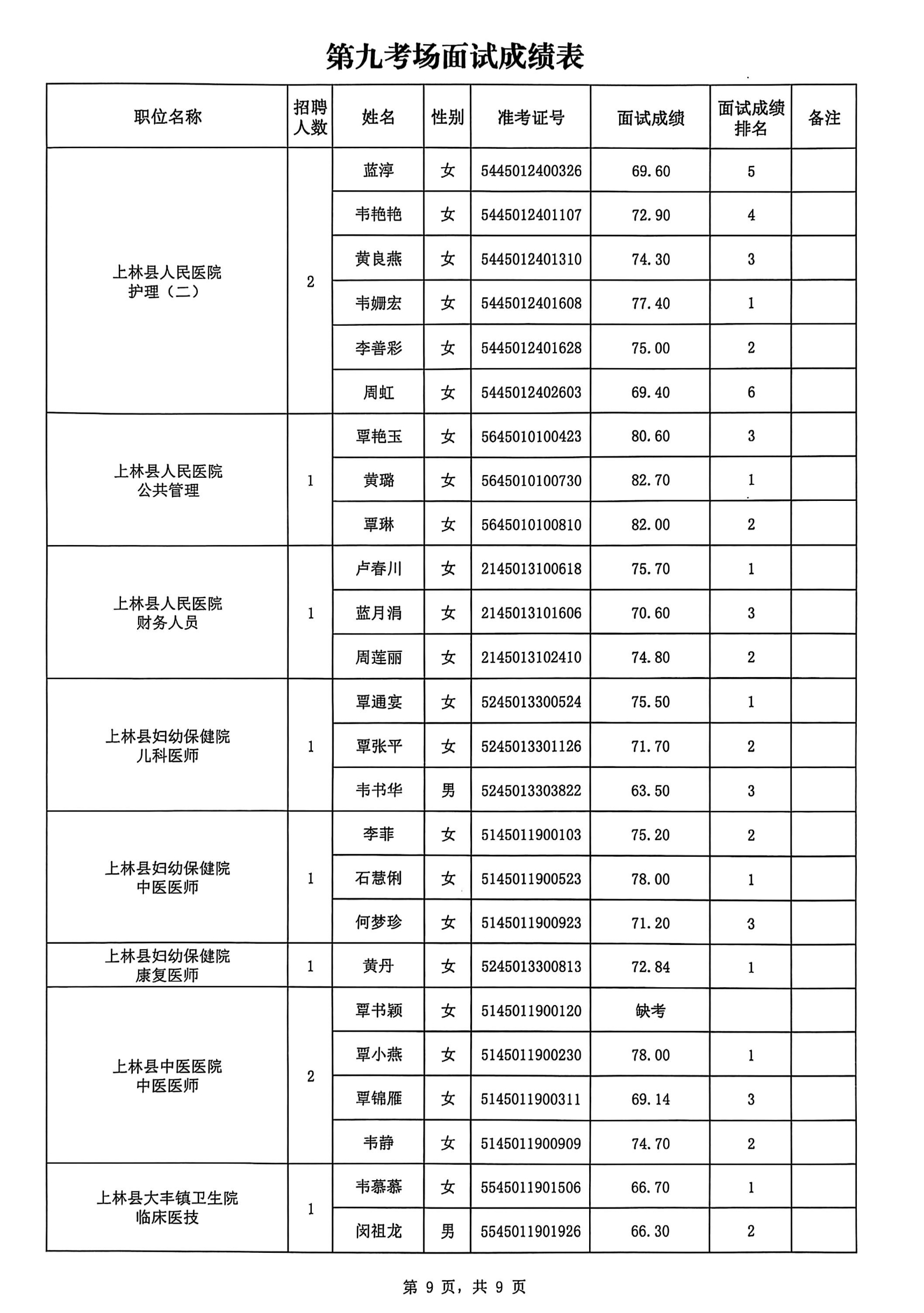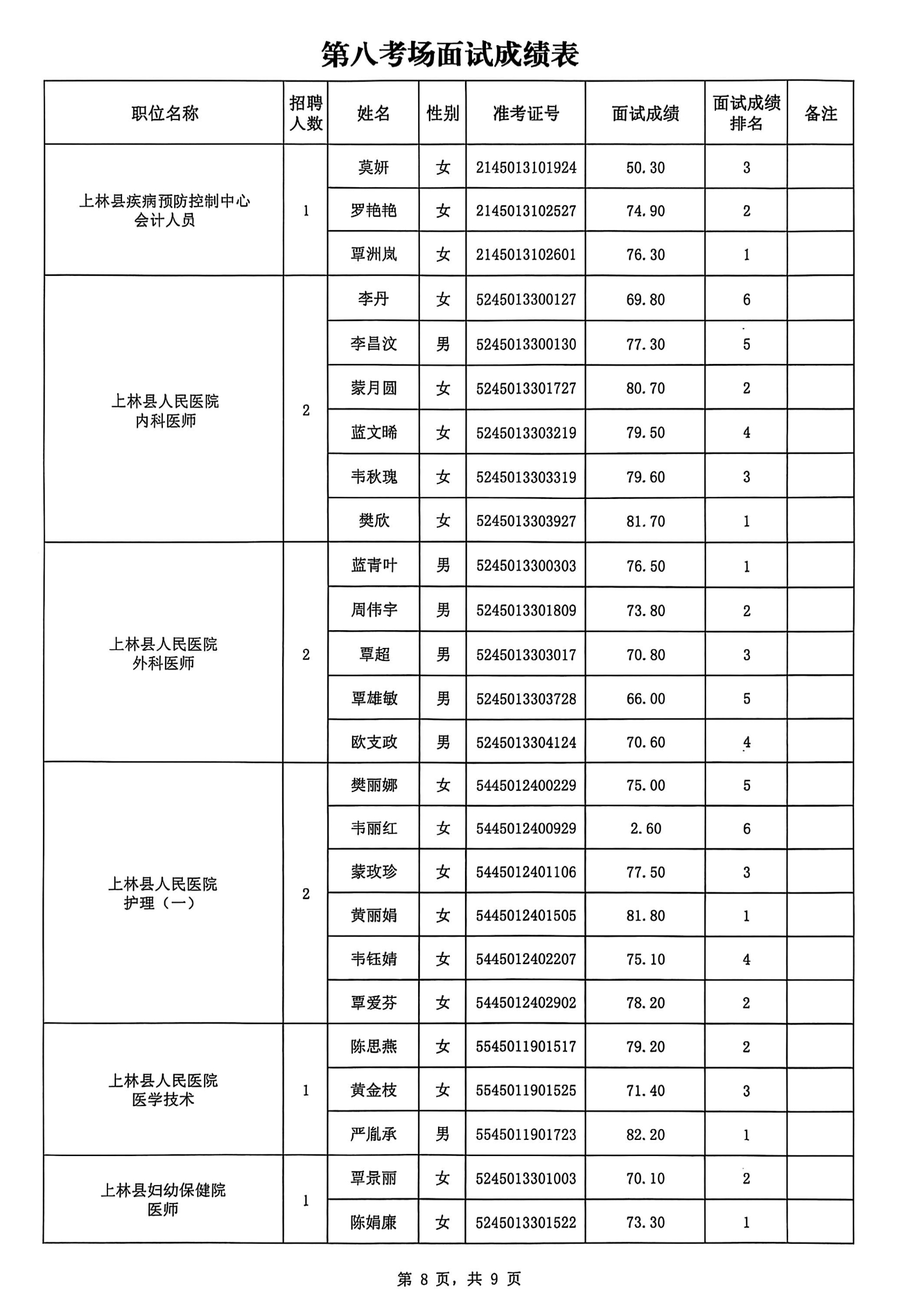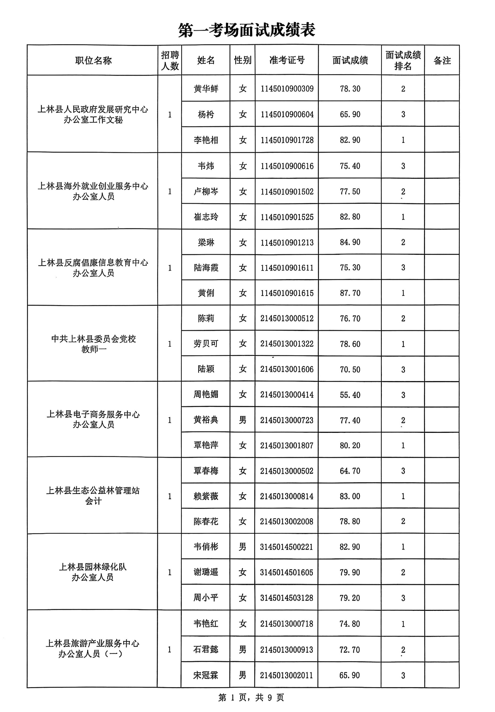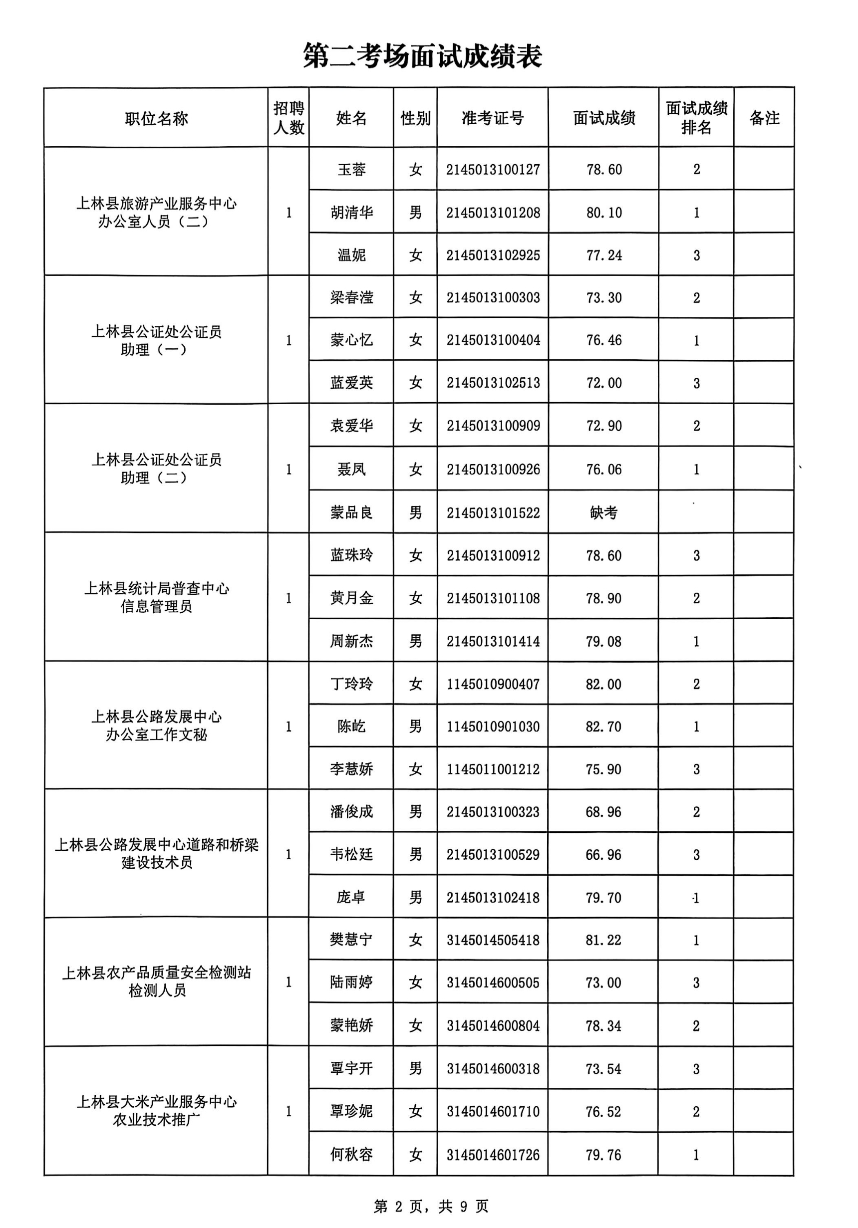 上林縣2025年公開考試招聘事業(yè)單位工作人員面試成績公布如下: