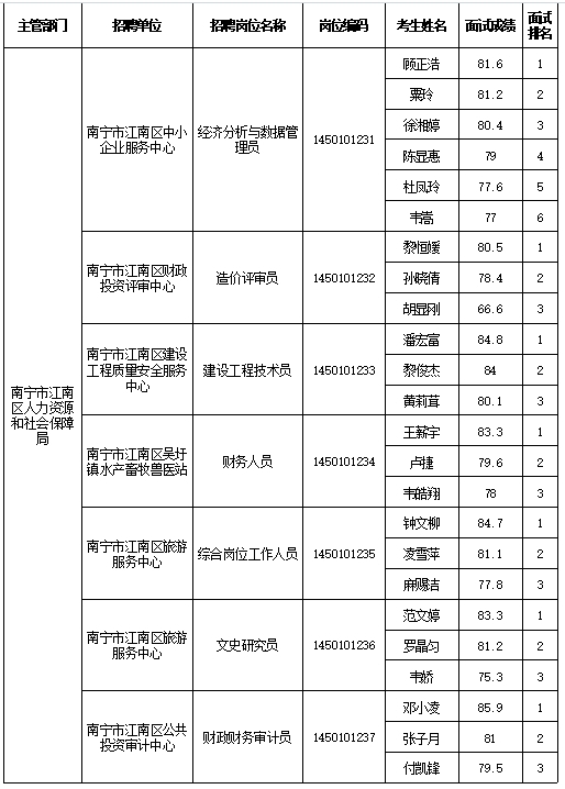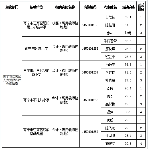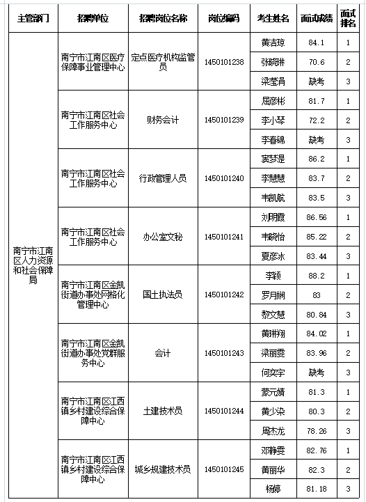 南寧市江南區(qū)人力資源和社會(huì)保障局2025年公開考試招聘事業(yè)單位工作人員面試成績(jī)表