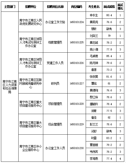 原文標(biāo)題:南寧市江南區(qū)人力資源和社會(huì)保障局2025年公開考試招聘事業(yè)單位工作人員面試成績(jī)表
