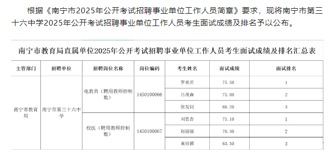 南寧市教育局關于公布南寧市第三十六中學2025年公開考試招聘事業(yè)單位工作人員考生面試成績及排名的公告
