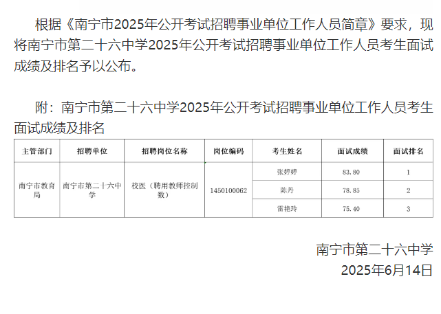 南寧市第二十六中學(xué)關(guān)于公布2025年公開考試招聘事業(yè)單位工作人員考生面試成績及排名的公告