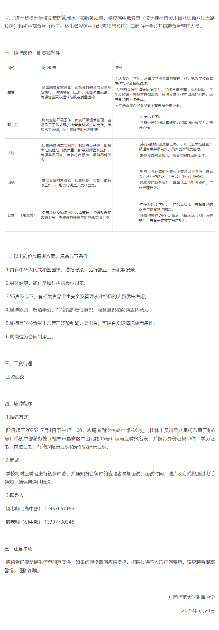 2025年廣西師范大學附屬中學食堂人員招聘公告