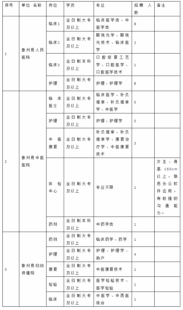 因工作需要,根據(jù)相關(guān)規(guī)定,我單位擬面向社會(huì)公開招聘見習(xí)人員42名,其中象州縣人民醫(yī)院19人、象州縣中醫(yī)醫(yī)院15人、象州縣婦幼保健院8人?,F(xiàn)將有關(guān)事項(xiàng)通知如下: