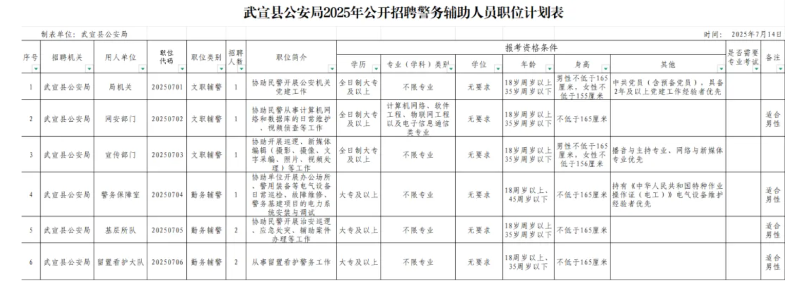 招聘人數(shù):8人,詳見(jiàn)《武宣縣公安局2025年第二次面向社會(huì)招聘輔警職位計(jì)劃表》(附件1)。