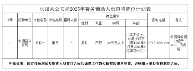 (五)已通過永福縣公安機(jī)關(guān)組織的警務(wù)輔助人員招聘各項(xiàng)環(huán)節(jié),非因不可抗拒原因,放棄受聘資格的或聘用后未按要求到崗的,不得再次報(bào)考。