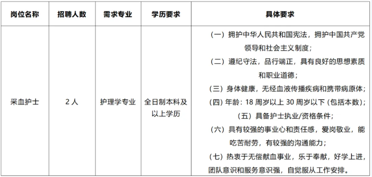 報名所需材料:《河池市中心血站公開招聘報名表》(附件)、個人簡歷、畢業(yè)證書、學(xué)位證書、護士執(zhí)業(yè)證/資格證、身份證等,若個人具備特長,需一并附上相關(guān)佐證材料。請攜帶以上材料原件及復(fù)印件至指定報名地點。應(yīng)聘人員應(yīng)對報名材料的真實性負(fù)責(zé),凡弄虛作假的,一經(jīng)查實,即取消報名和聘用資格。