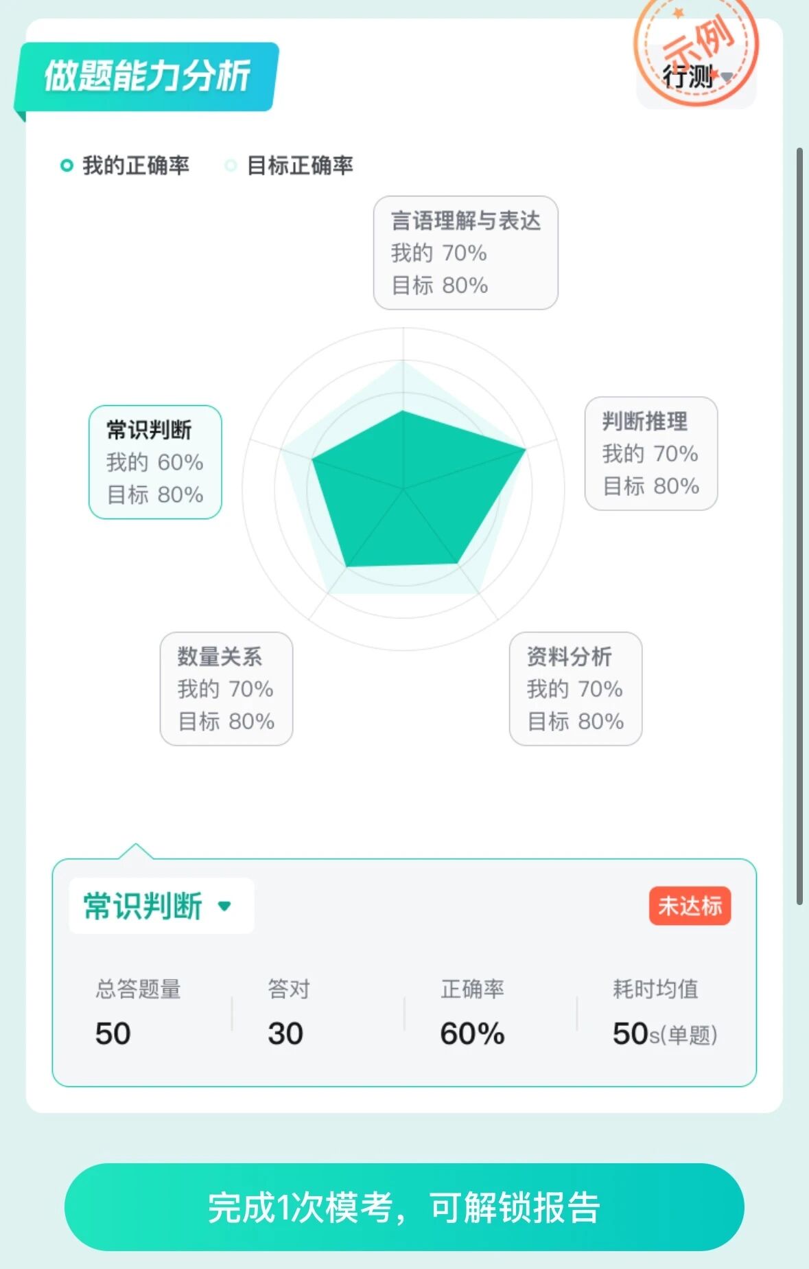 3??生成個人??紙蟾妫?/span>考完就能查看模考成績、排名及解析,生成的個人??紙蟾姘髂K正確率分布、做題能力分析、筆試分數(shù)yu測等內(nèi)容。