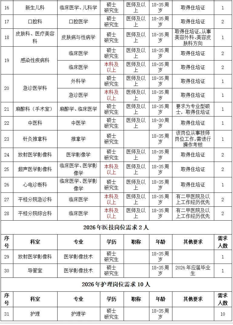 根據(jù)醫(yī)院發(fā)展規(guī)劃,招聘工作堅持公平公正公開,堅持德才兼?zhèn)?、人崗相適、擇優(yōu)錄取、雙向選擇的原則,2026年計劃引進(jìn)博士、碩士高層次人才及招聘工作人員共計50名(詳見附件:賀州市人民醫(yī)院2026年招聘需求信息)。