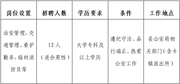 此次招聘的輔警屬勞動(dòng)合同用工性質(zhì),由扶綏縣公安局統(tǒng)一招聘,安排在縣公安局相關(guān)部門(mén)(具體職位安排如下)。