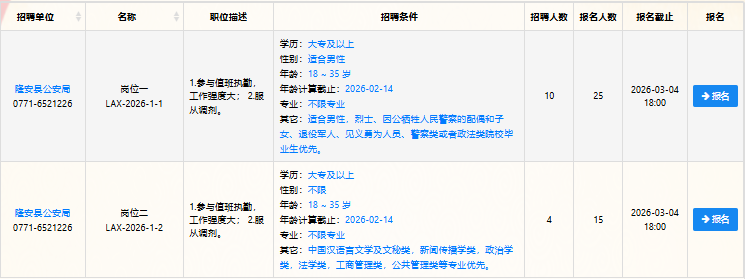 (一)報名咨詢方式:隆安縣公安局政工室,電話:0771-6512265(工作日上午8:00-12:00,下午15:00-18:00)。