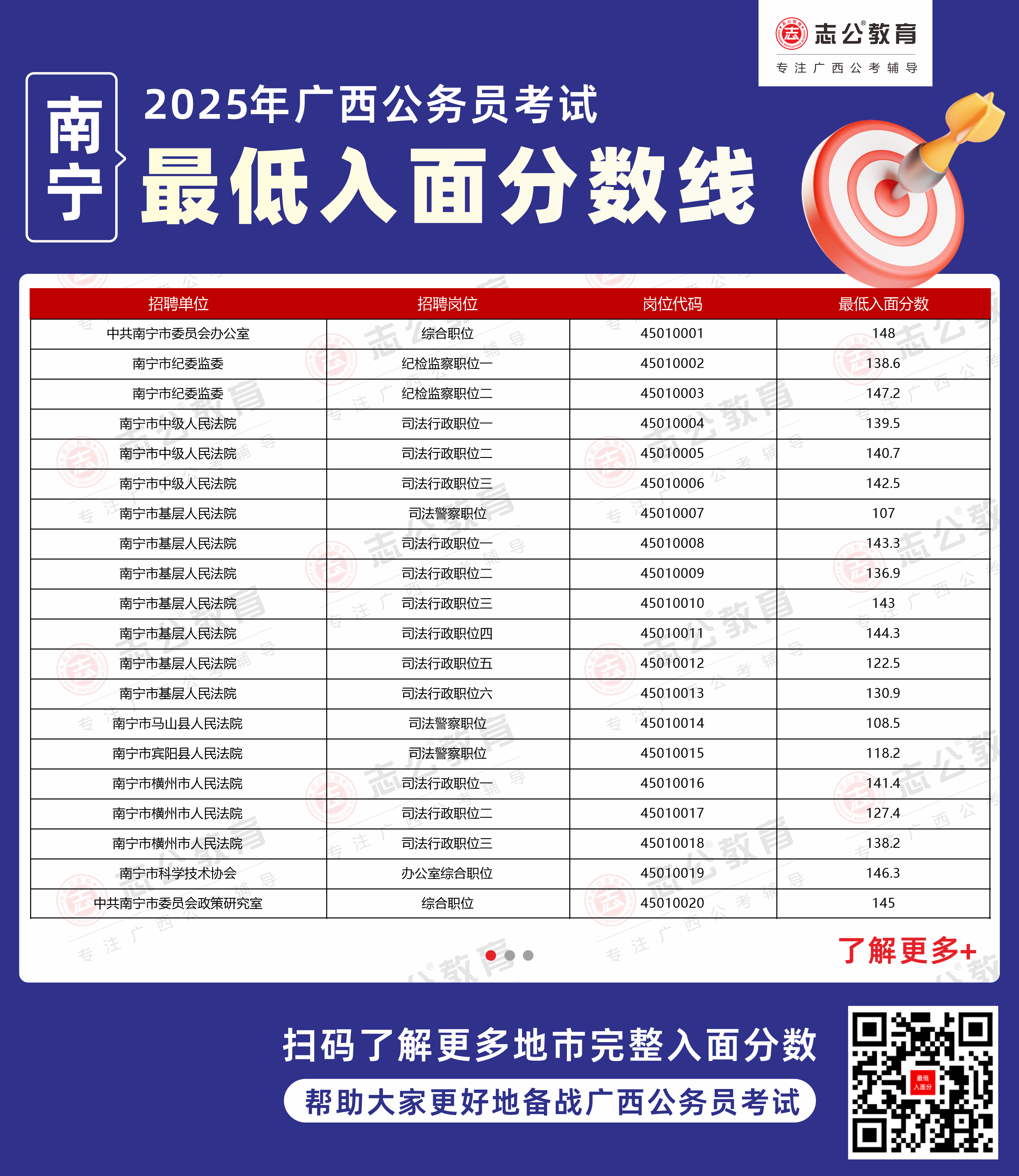 以下為志公教育根據(jù)官方公布的面試資格審查名單整理的南寧市部分單位的進面最低筆試分數(shù)(含照顧加分),數(shù)據(jù)僅供參考,具體以官方實際公布為準。