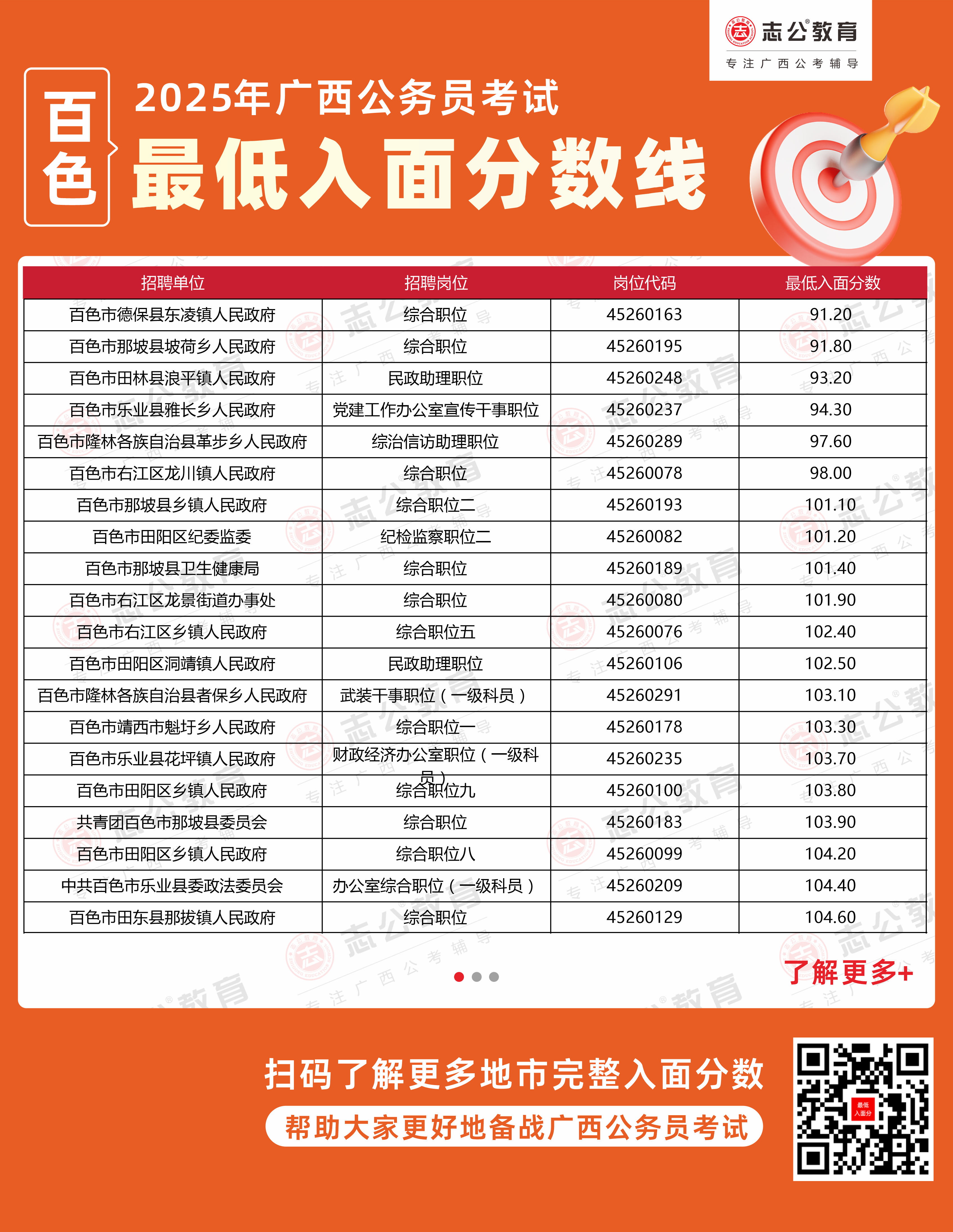 以下為志公教育根據(jù)官方及公開數(shù)據(jù)整理的2025年百色市公務員進面分數(shù)范圍,數(shù)據(jù)僅供參考,具體以官方實際公布為準。
